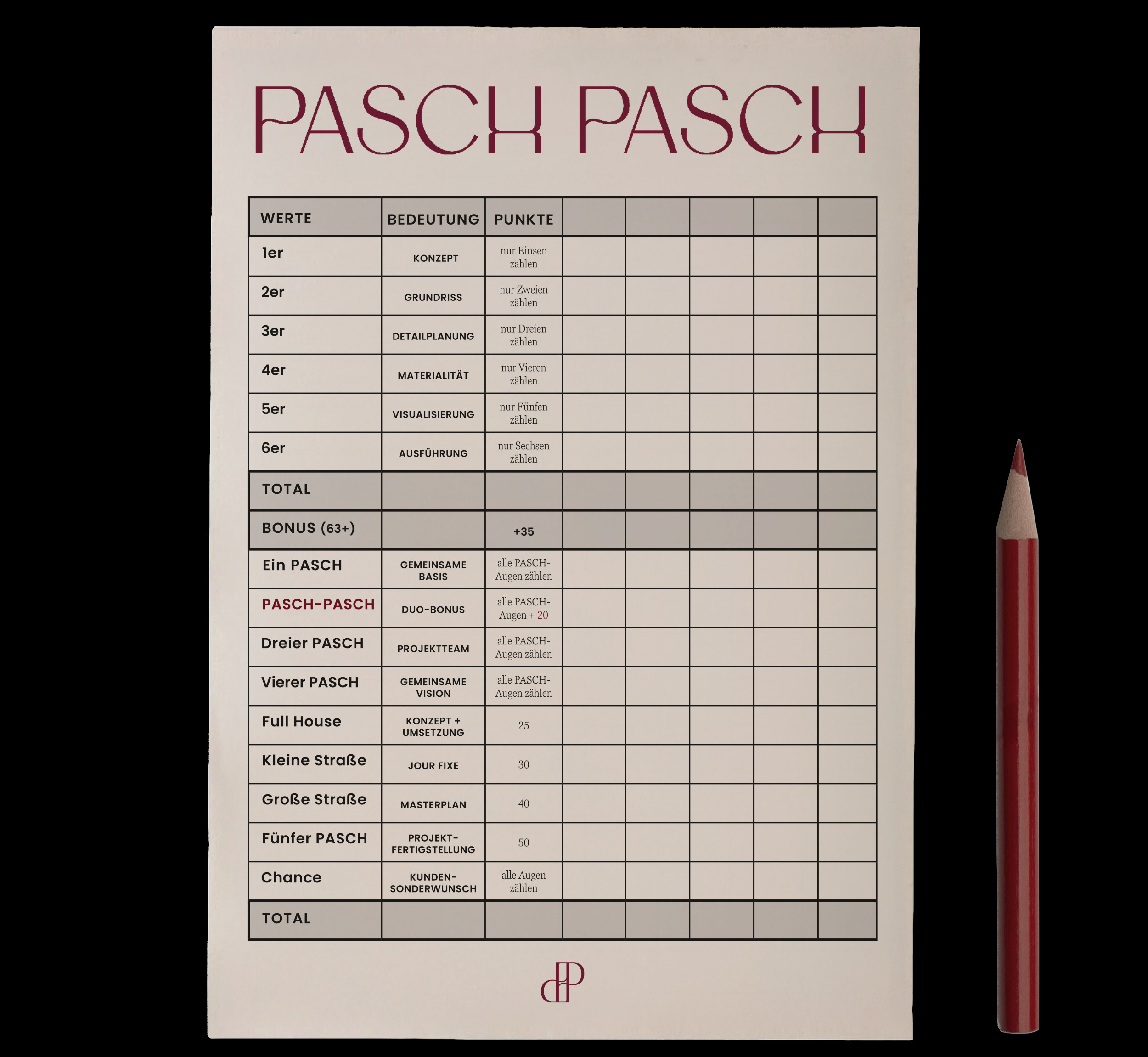 PASCH PASCH orientiert sich am klassischen Kniffel-Prinzip. Gespielt wird mit fünf Würfeln und einem Punkteblock.