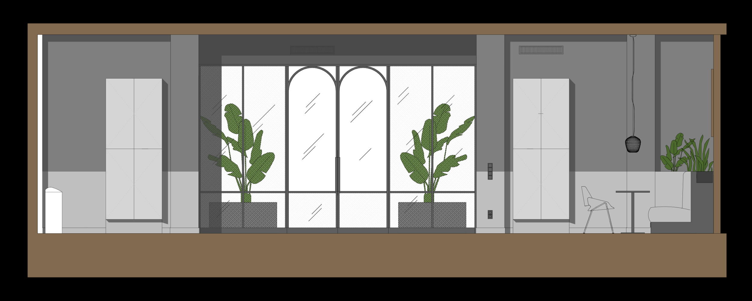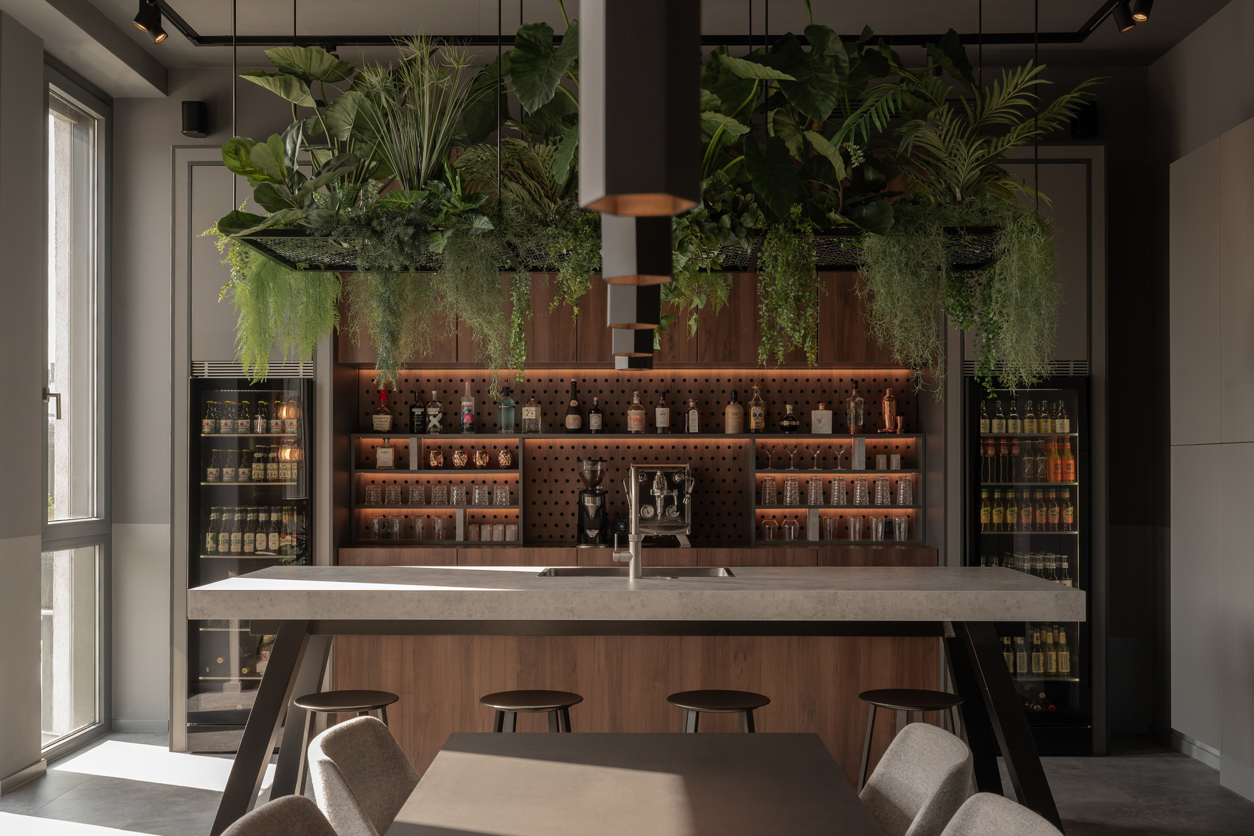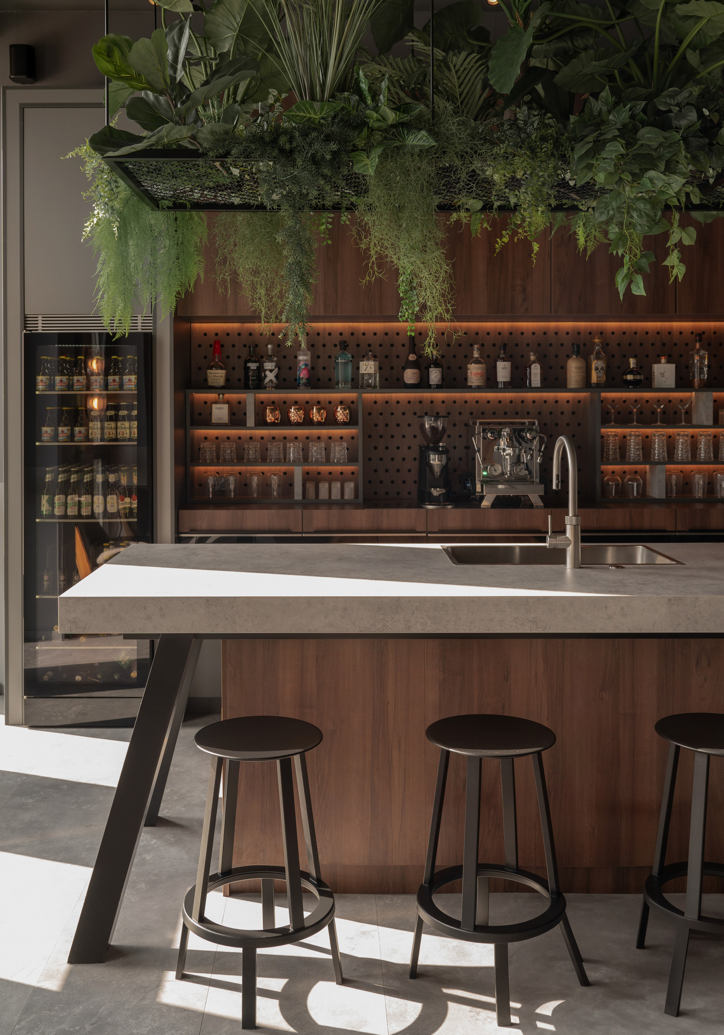 Die Kitchen & Bar erhebt sich als urbaner Tropen-Retreat im Industrial Loft – eine Gemeinschaftsküche, die wie eine Hotelbar im Dschungel wirkt. Über den Köpfen rankt ein üppiger Urwaldgarten bis in 3 Meter Höhe, der die Bar zur Bühne für kreative Pausen und Begegnungen macht.