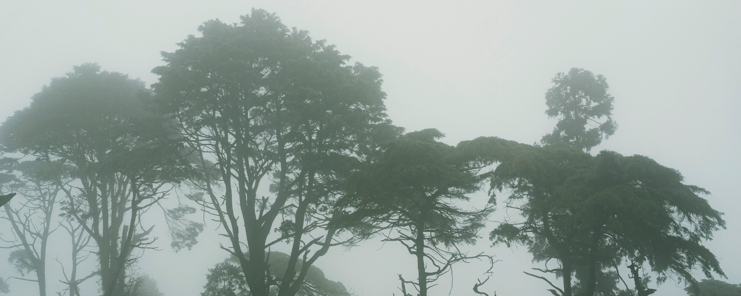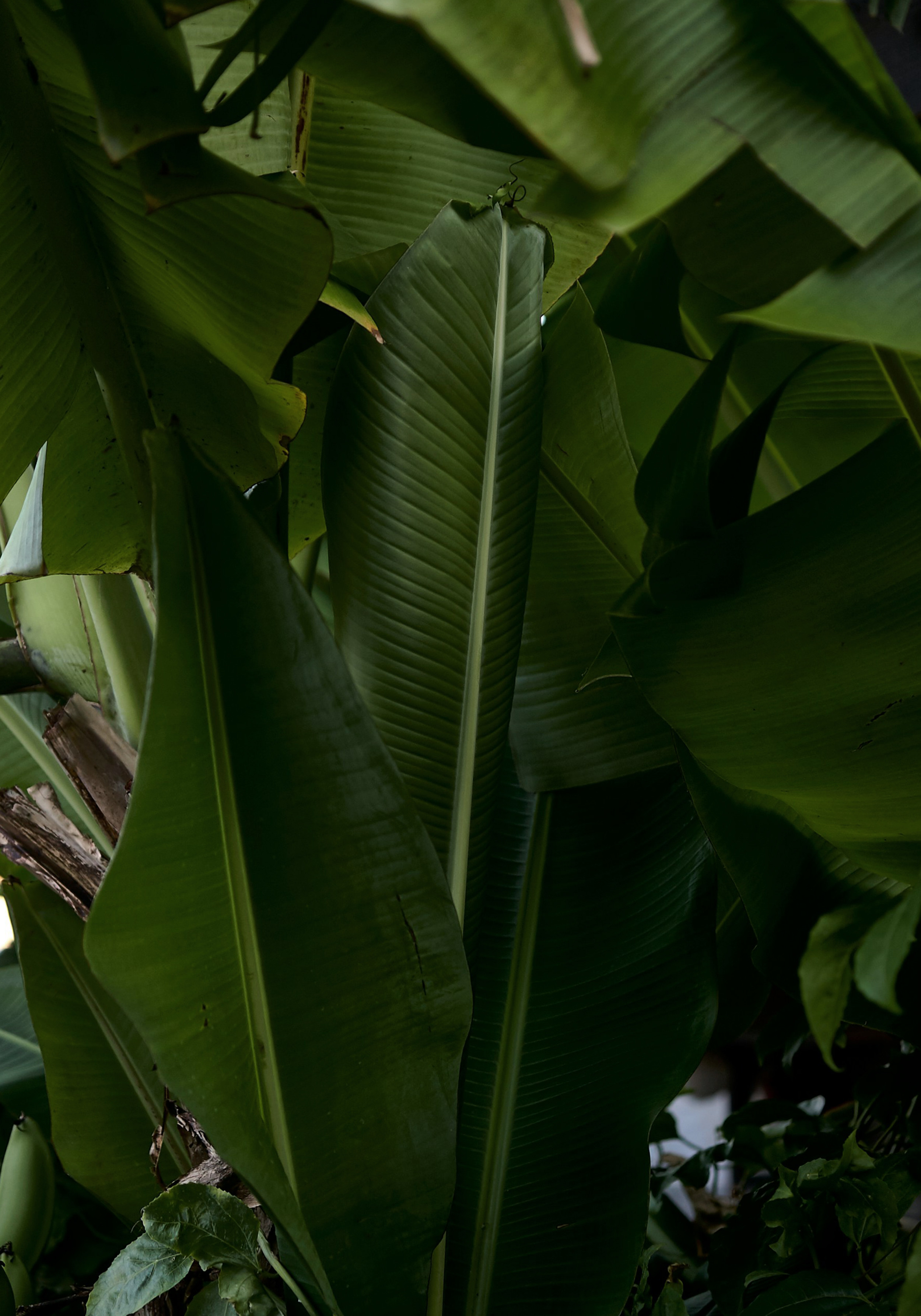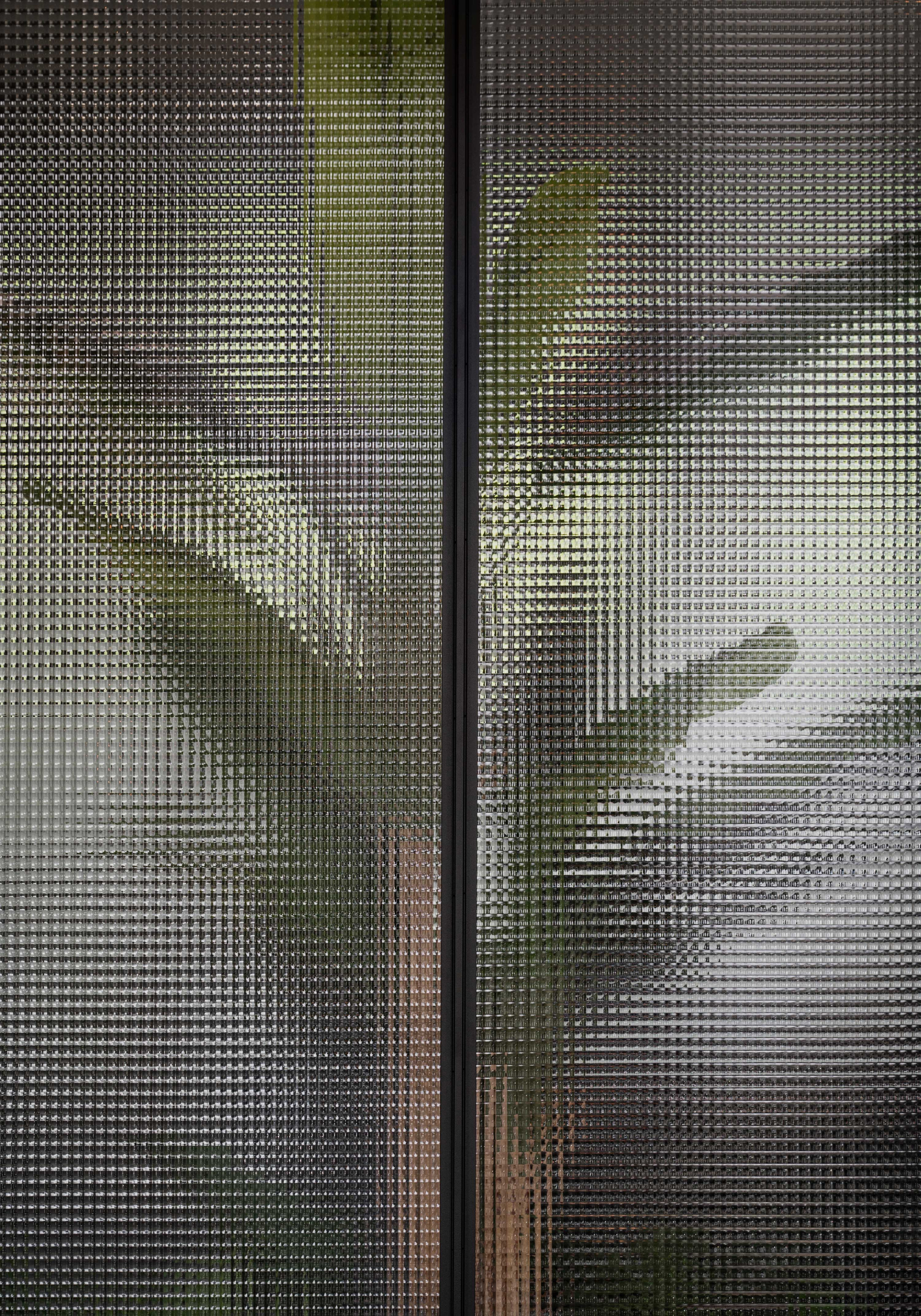 Von außen drücken sich Palmen wie in einem Gewächshaus an das Ornamentglas.