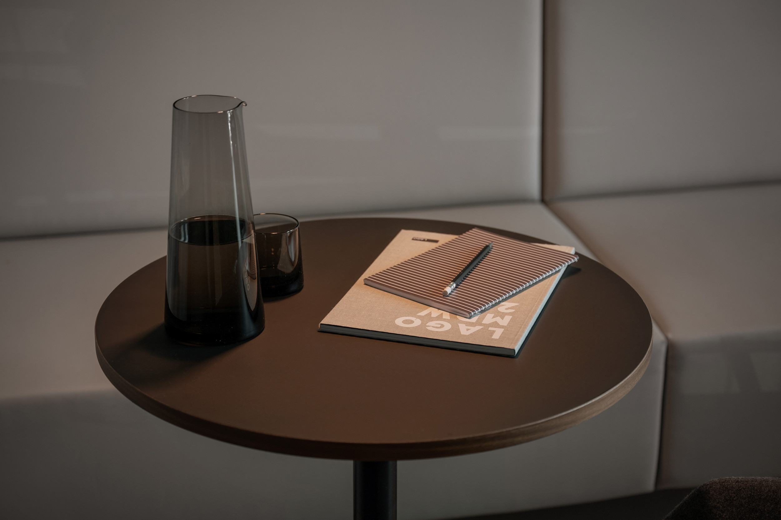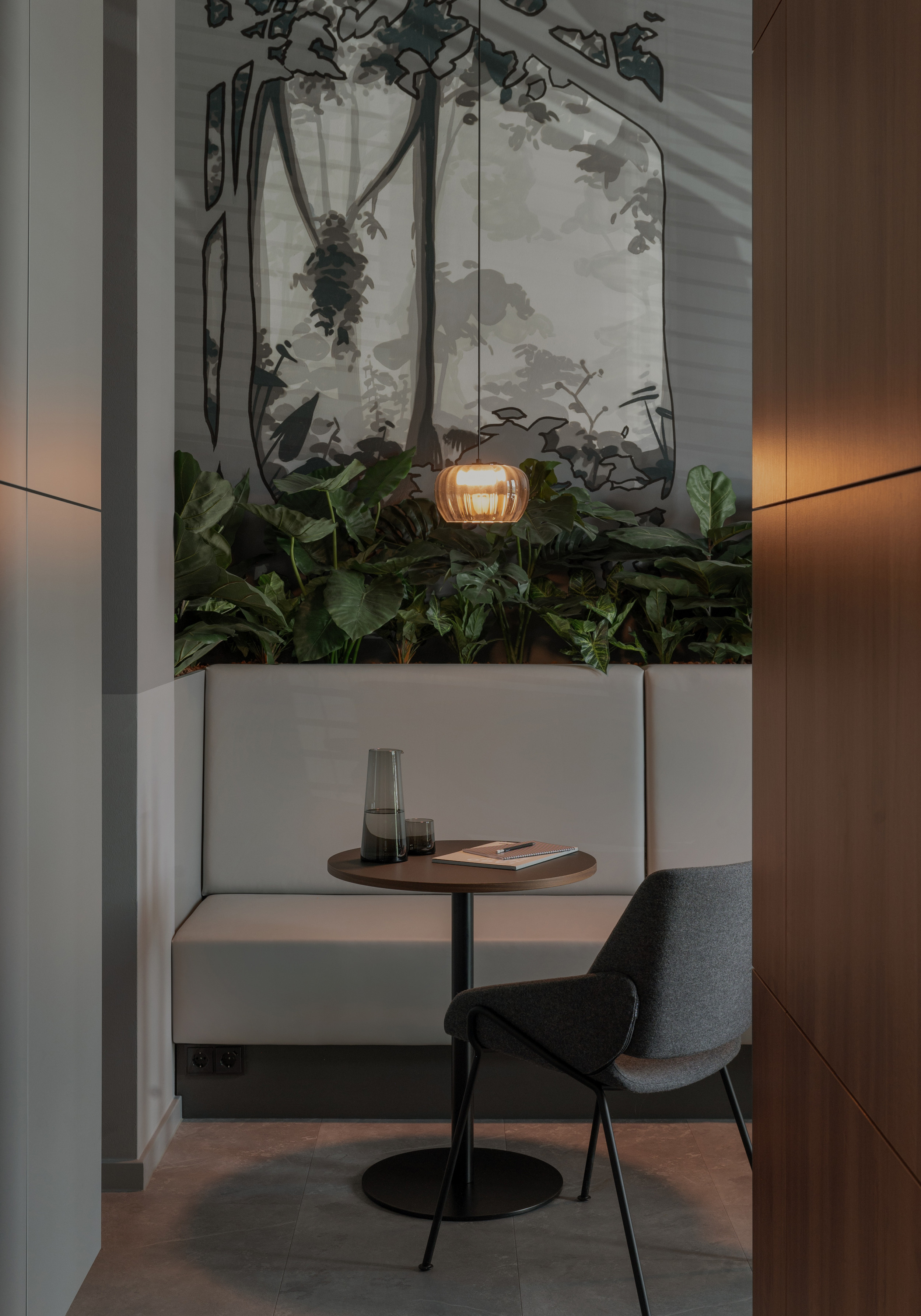 Zwischen urbanem Bistro-Charakter und grüner Oase lädt der Bereich dazu ein, sich an den runden Tischen mit dem Laptop zurückzuziehen und konzentriert zu arbeiten.