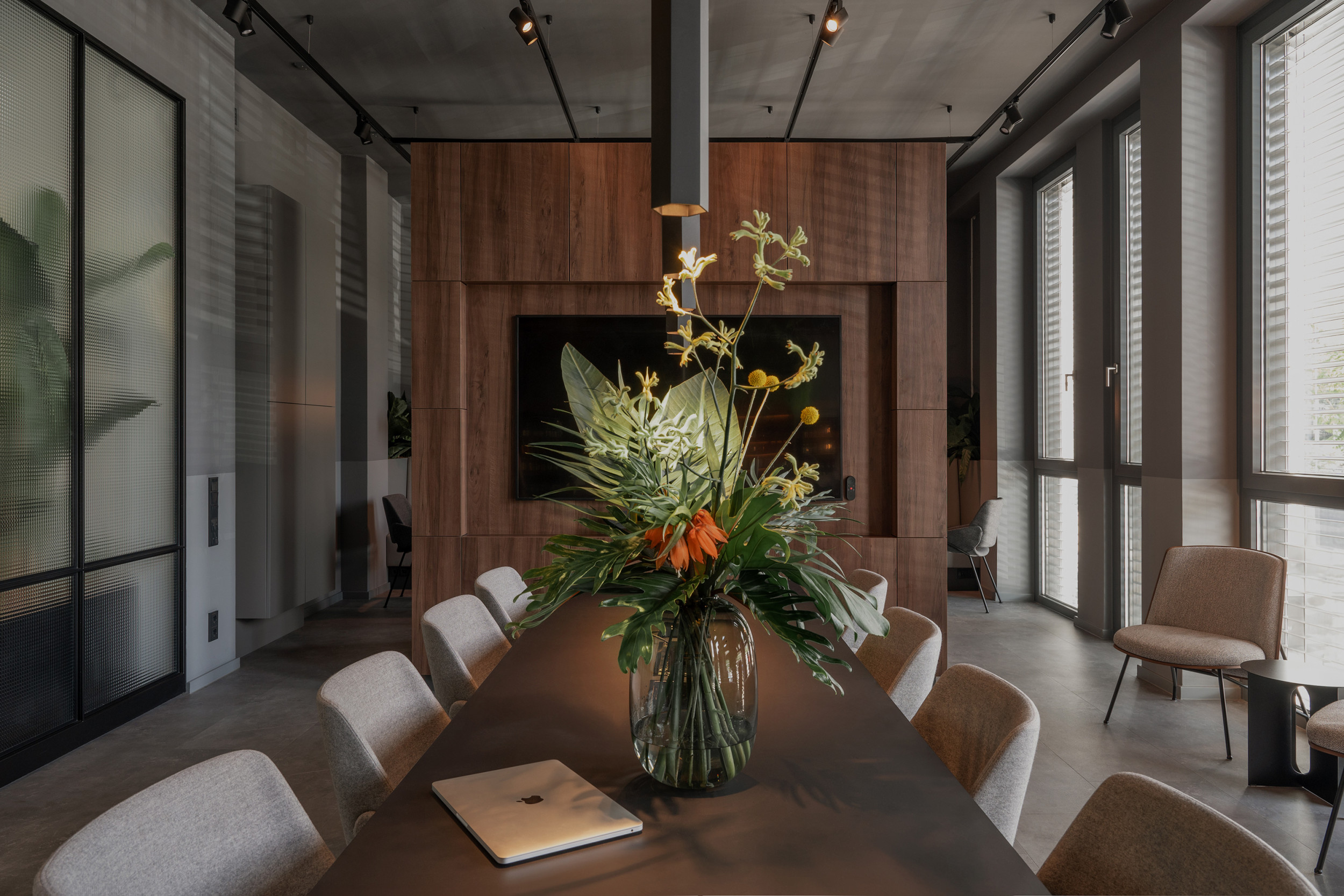 Der separate Konferenzraum knüpft gestalterisch nahtlos an das Working Café an und setzt dessen Atmosphäre fort. Große, echte Pflanzen bringen ein tropisches Ambiente in den Raum und schaffen eine natürliche Frische.