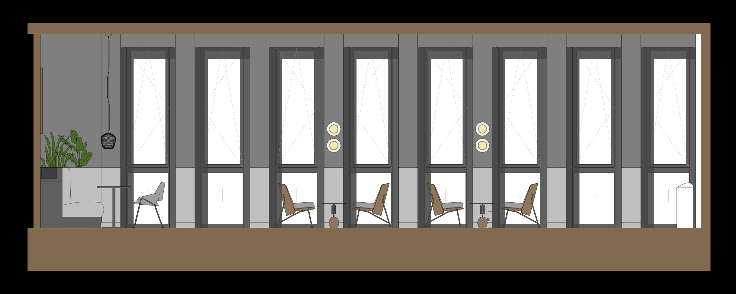 Auf der Rückseite des Holz-Cubes verbirgt sich ein offener Think Tank – ein ruhiger Ort zum fokussierten Arbeiten oder für entspannte Meetings zwischendurch. Der Café-Bereich erinnert an ein modernes Bistro: Eine eingebaute Sitzbank dient gleichzeitig als Pflanzgefäß für üppige tropische Vegetation und verstärkt die lebendige Atmosphäre.