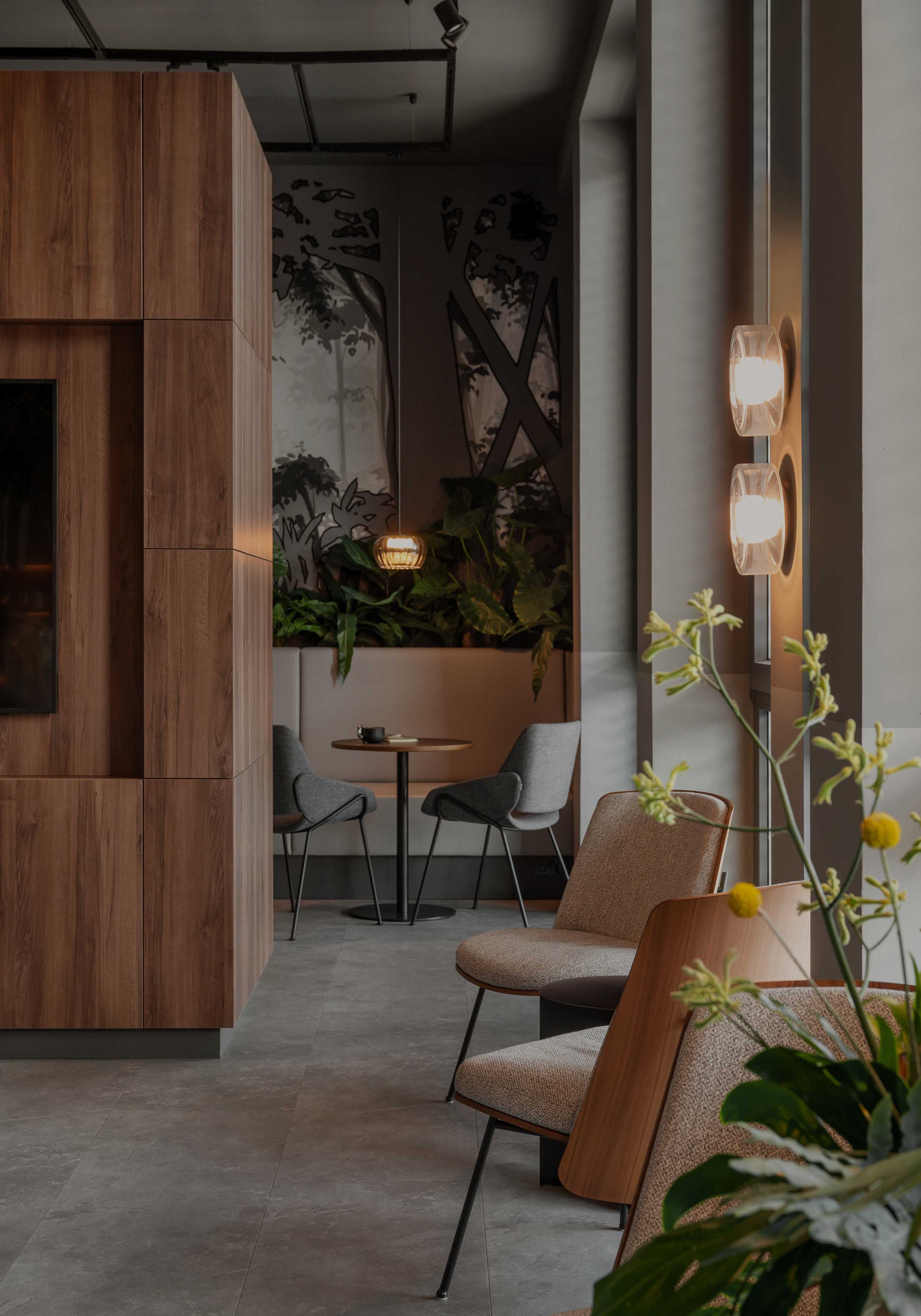 Ein speziell abgestimmtes Graffiti eines Tropenwaldes greift die Farbnuancen der Wände auf und zieht den Betrachter optisch in die Tiefe. So entsteht eine mehrdimensionale Illusion, die dem Raum einen urbanen, zugleich natürlichen Look verleiht.
