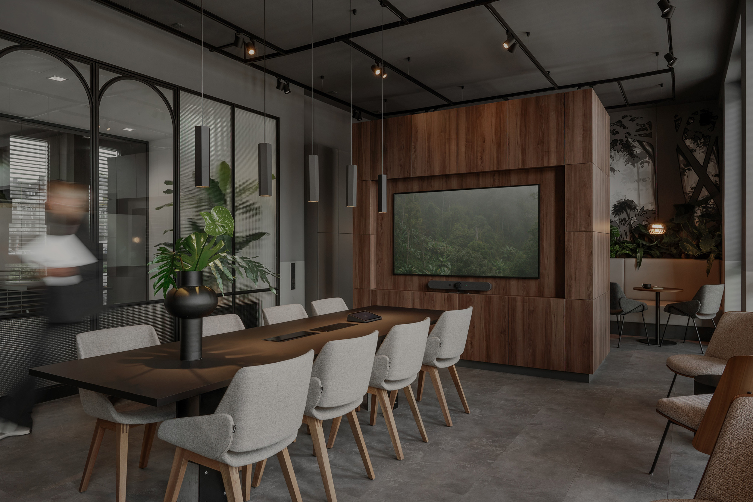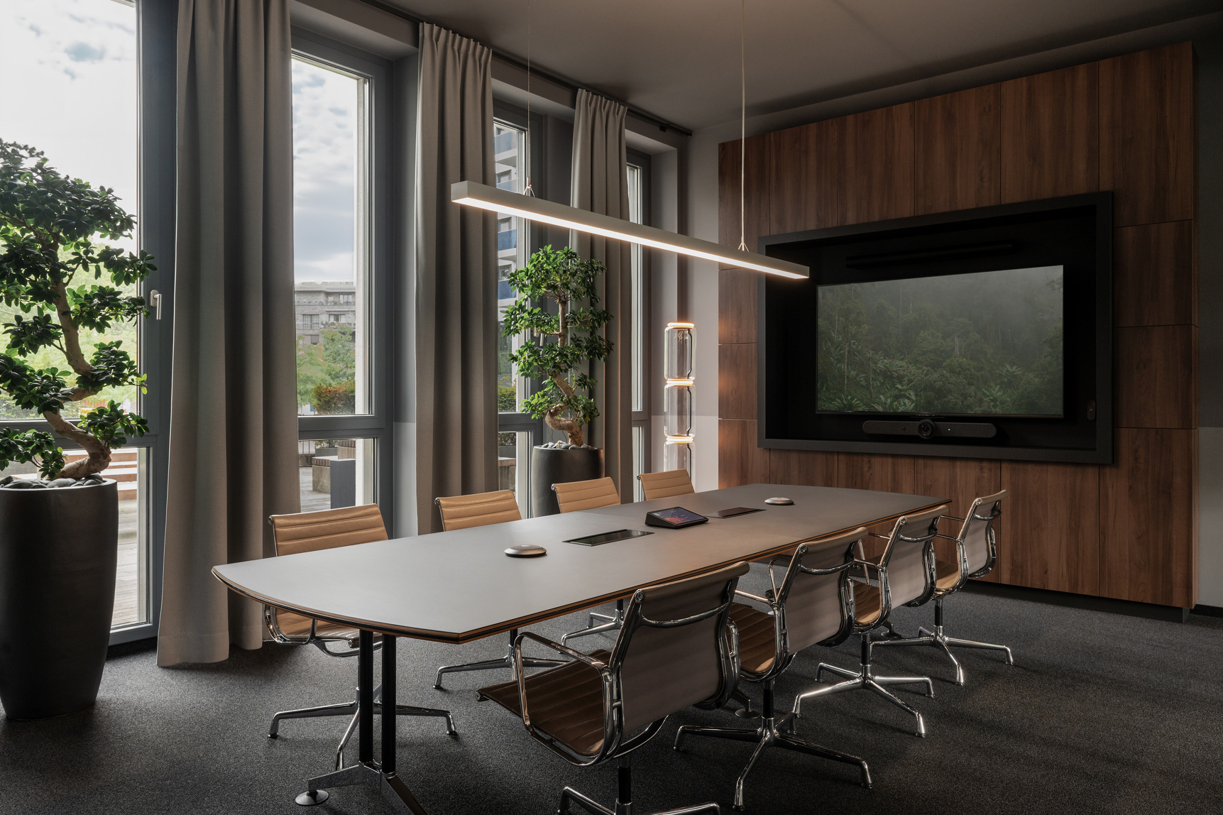 Das maßgefertigte TV-Möbel mit Konferenz-Equipment greift die gleiche Holz-Optik wie im Working Café auf und sorgt so für gestalterische Kontinuität. Ergänzend verbessern Akustik-Vorhänge nicht nur die Raumakustik, sondern verleihen dem Setting zugleich eine weiche, elegante Note.