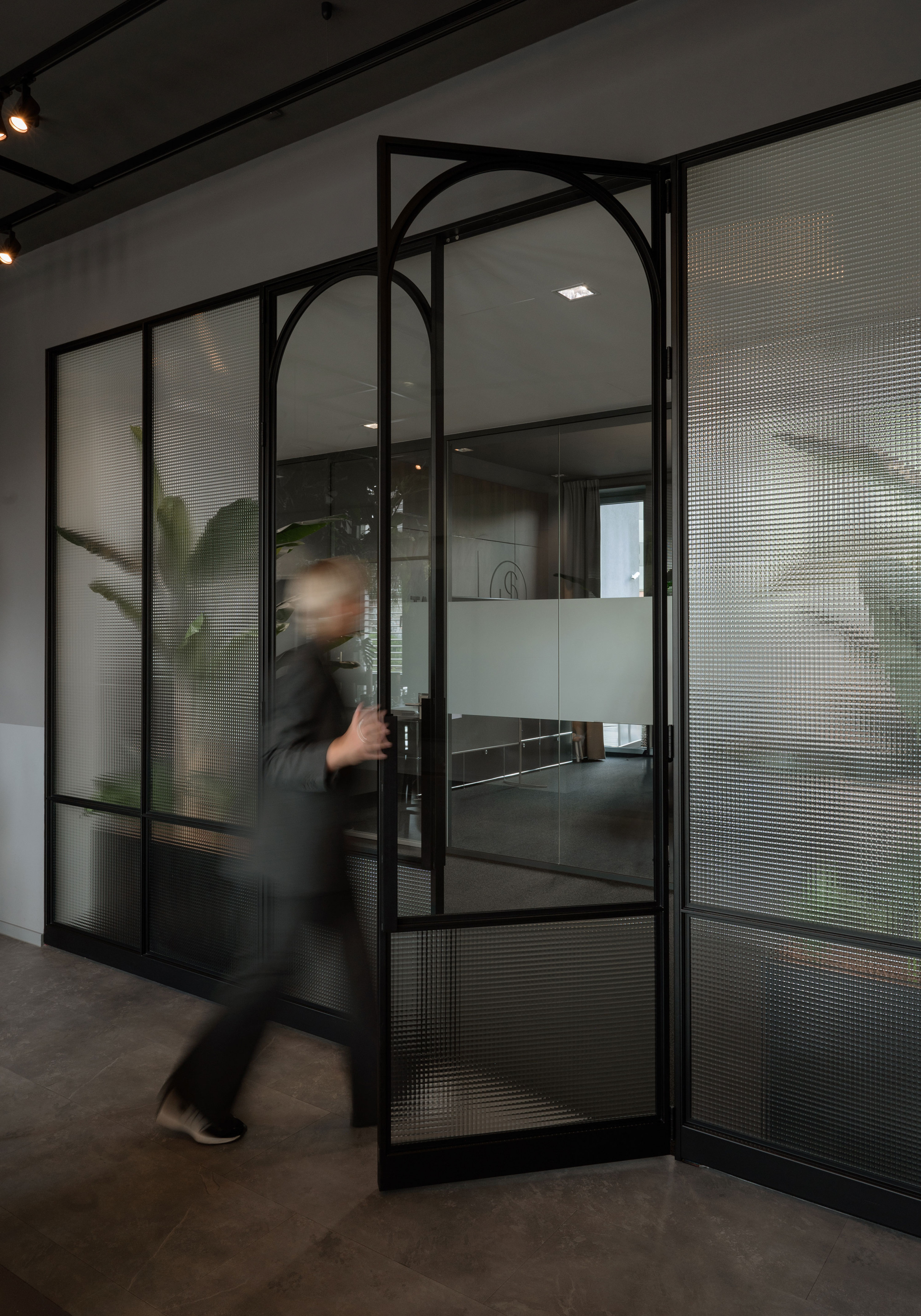 Ein symmetrisches Stahl-Glas-Portal öffnet den Eingangsbereich.