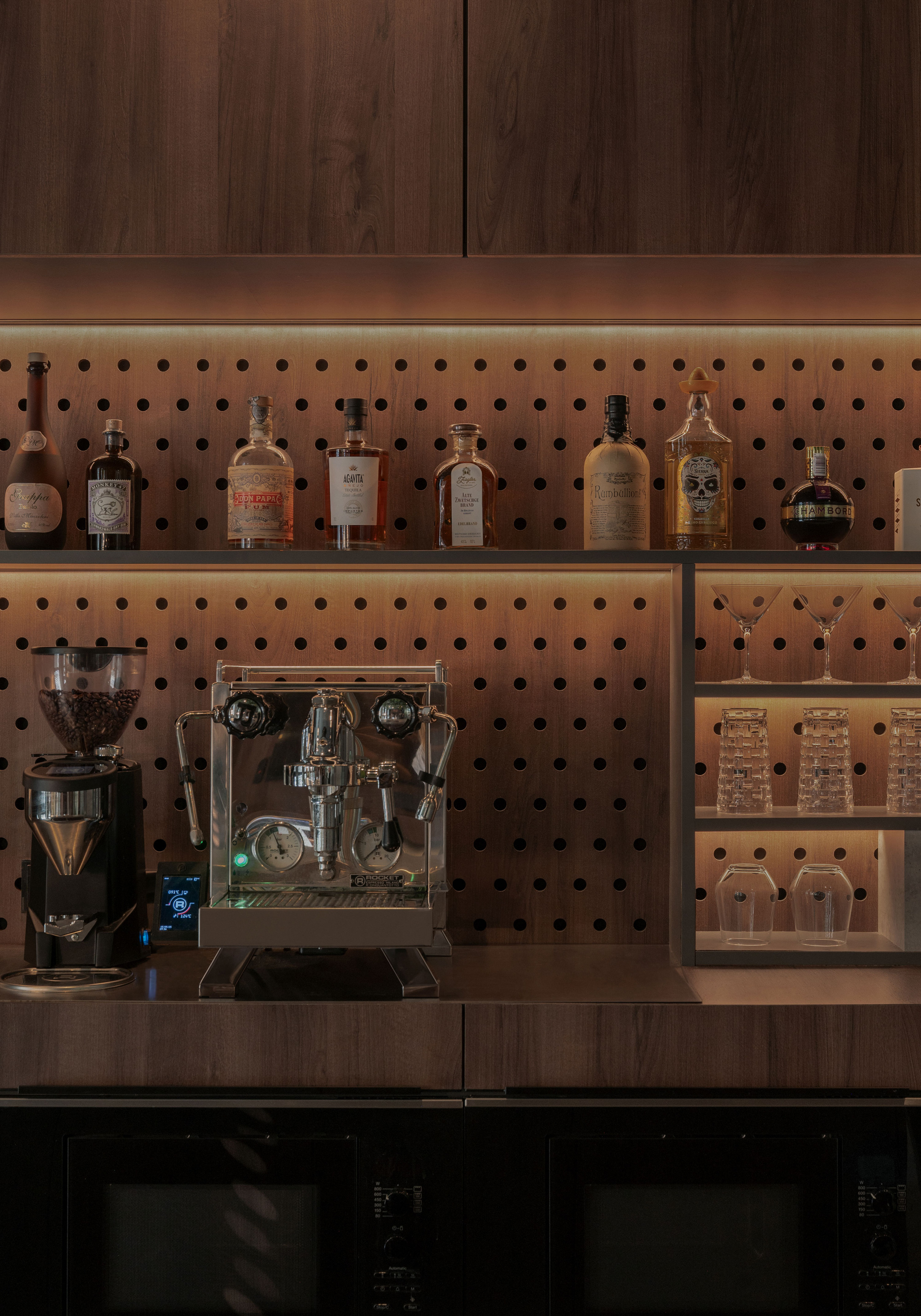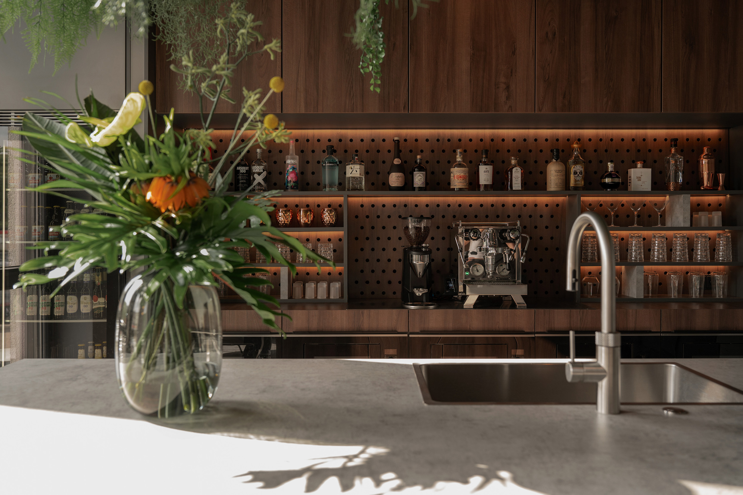 Die Kitchen ist funktional durchdacht und zugleich ästhetisch reduziert: Fünf Mikrowellen sind unsichtbar unterhalb der Arbeitsfläche integriert, sodass die klare Optik erhalten bleibt. Ergänzt wird sie durch eine hochwertige Siebträgermaschine, einen Quooker für heißes und gefiltertes Trinkwasser sowie reichlich Stauraum.