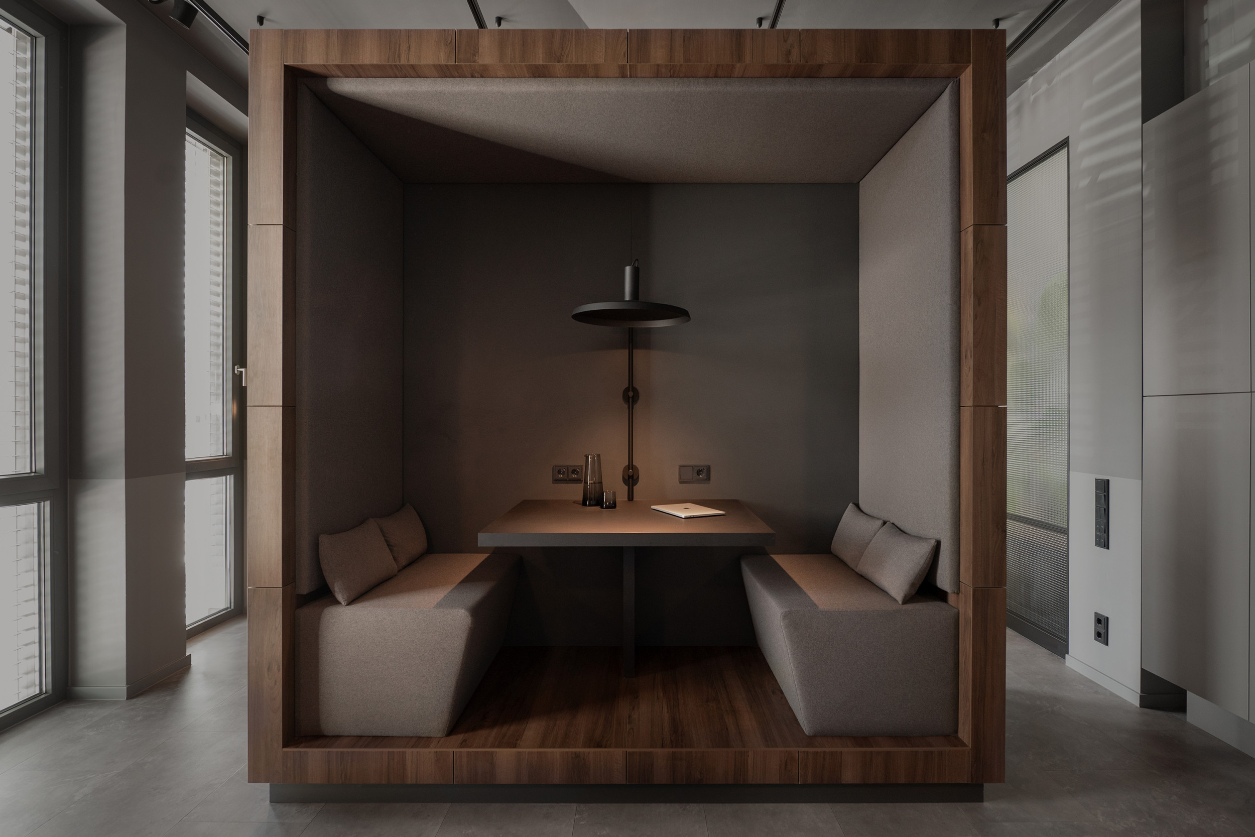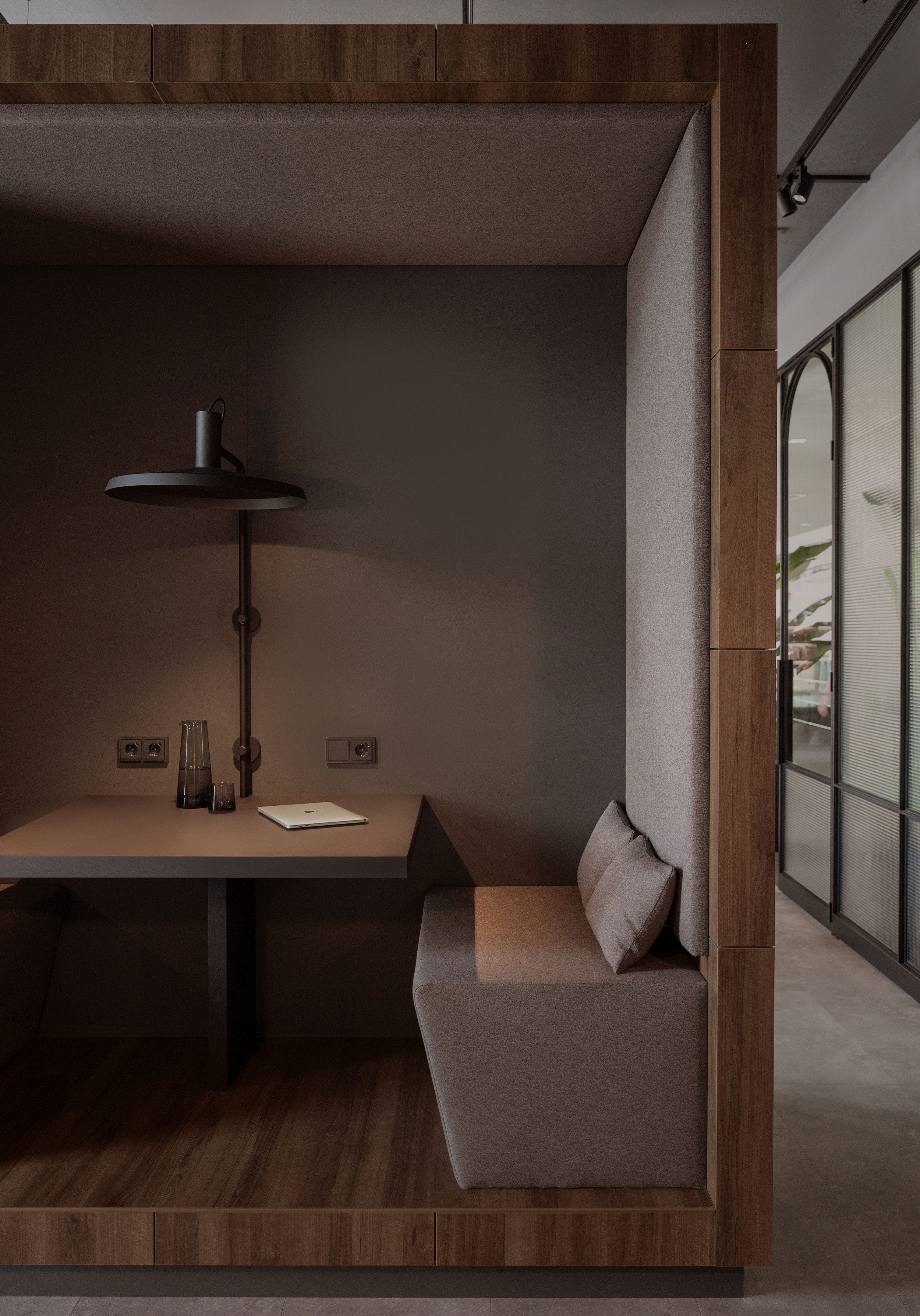 Der Think Tank im freistehenden Holz-Cube zoniert den Bistrobereich und schafft Raum für konzentriertes Arbeiten.