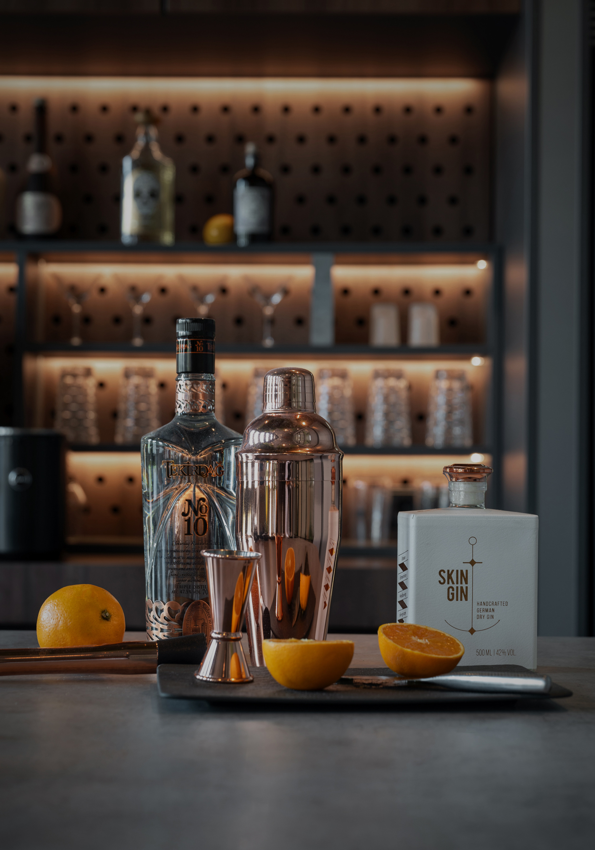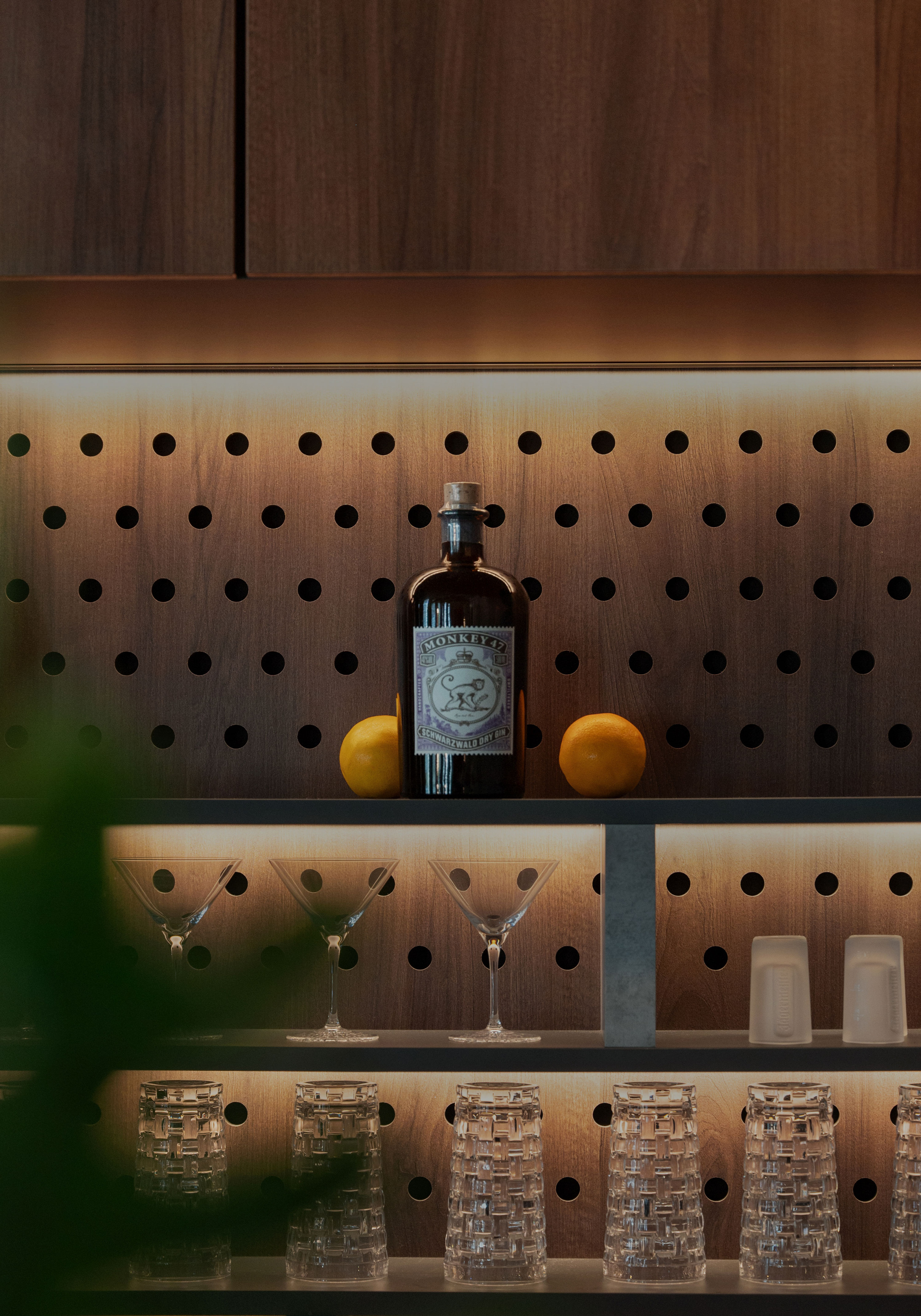 Die Bar inszeniert sich als kommunikatives Zentrum – ausgestattet mit zwei großzügigen Getränkekühlschränken, einer gut bestückten Auswahl und einem Küchentresen mit Barstühlen in Werkbank-Optik. Ein Ort, der zum Austausch einlädt und die Atmosphäre zwischen Arbeit und After-Work nahtlos verbindet.