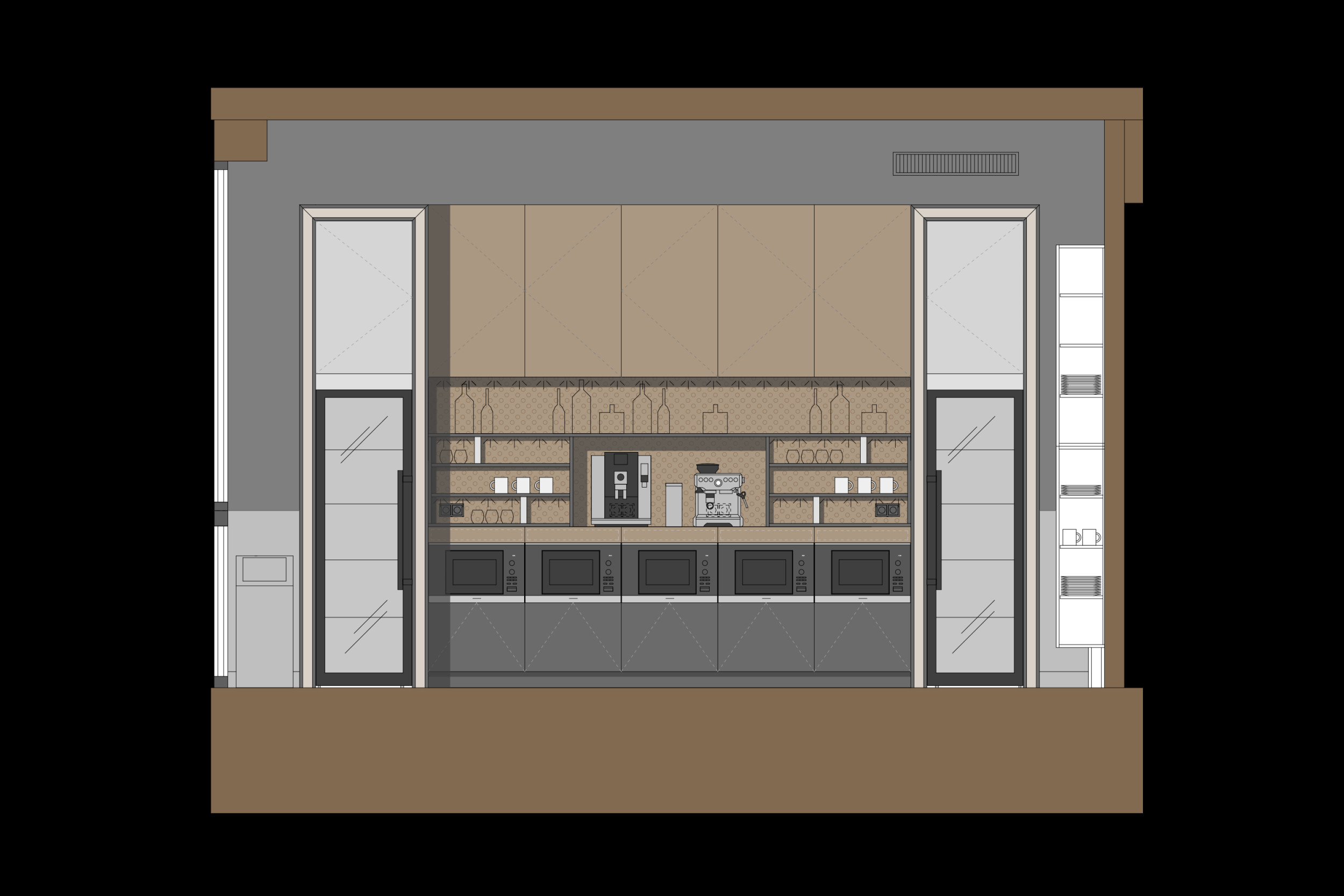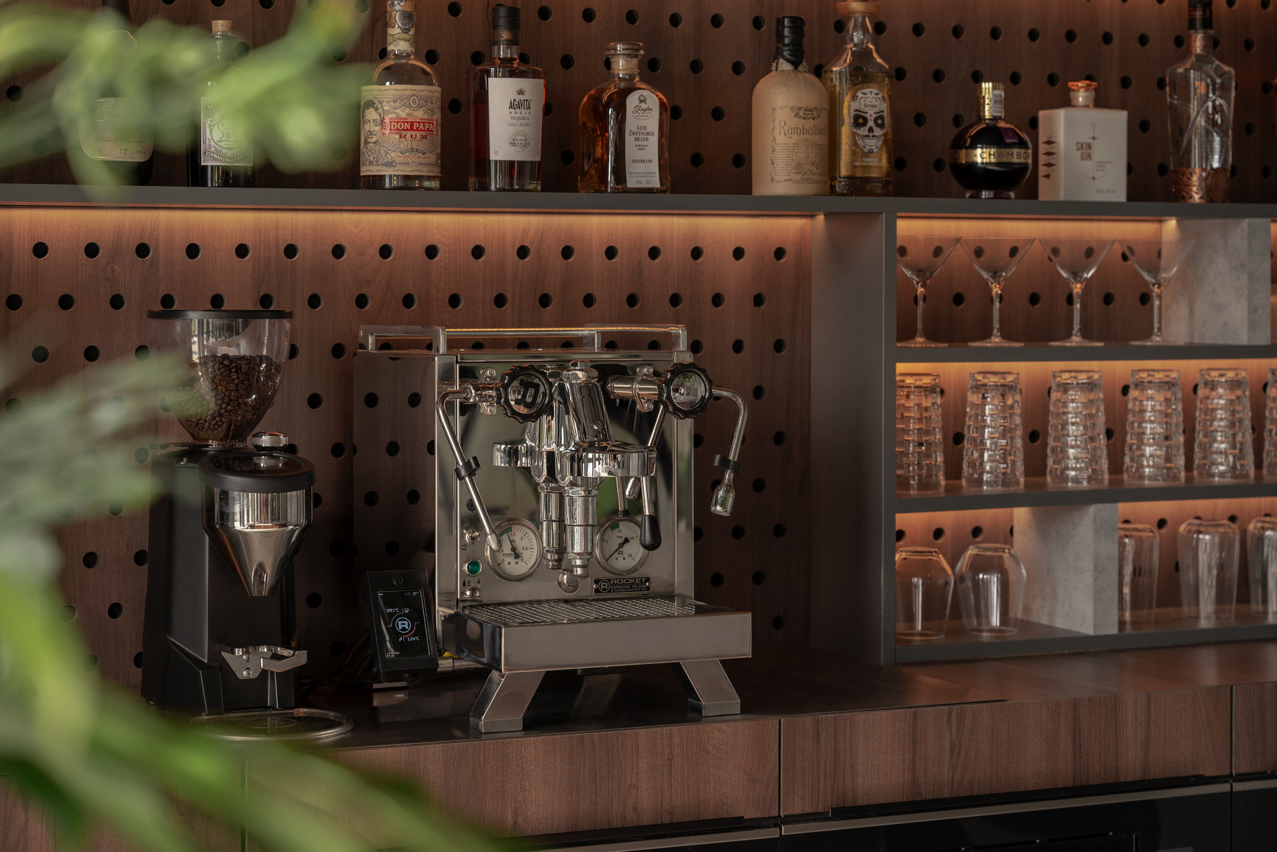 Die Siebträger-Maschine als Herzstück der neuen Kitchen-Bar. Bei der Gestaltung des Working Cafés war es wichtig, eine Mischung zwischen stylischer Bar, gemütlichem Café und Pausenraum zu schaffen. Alles zusammen verkörpert dieses Hybrid-Möbel.